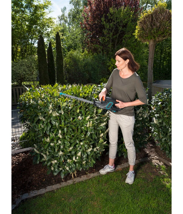 Im Gegensatz zu einer Elektro-Heckenschere, die immer höchste Aufmerksamkeit des Gärtners erfordert, arbeitet die GARDENA Heckenschere EasyCut Li mit einem hochwertigen, integrierten Akku mit einer Leistung von 14,4 V Li-Ion/2,0 Ah. Außerdem ist auch das Ladegerät im Lieferumfang inbegriffen, so dass Sie den Akku gleich aufladen und mit den Schneidearbeiten beginnen können. Geben Sie dem Akku der GARDENA Akku-Heckenschere EasyCut Li etwa 4 Stunden Zeit zum Aufladen, dann können Sie 60 Minuten ohne Pause Ihre Hecken in Form bringen.