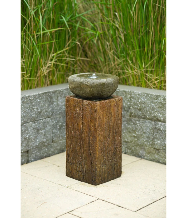Eine roh behauene Granitschale, die in ihrer rustikalen Machart wie ein Relikt aus grauer Vorzeit wirkt, thront auf einem massiven Holzblock, der einst der Stamm eines mächtigen Baumes gewesen sein muss. Das Ubbink Polyresin-Gartenbrunnen-Set Nashville ist ein außergewöhnliches Deko-Objekt, das in Ihrem Garten sofort für Aufsehen sorgen wird, sobald Ihre Gäste es entdecken. Und kaum einer wird ahnen, dass die Schale nicht aus Stein und der Baumstamm nicht aus Holz gefertigt wurden, sondern aus dem modernen Kunststein Polyresin. Dieses Material erlaubt Künstlern, Objekte extrem naturgetreu zu gestalten, gleichzeitig punktet es mit hervorragenden Outdoor-Eigenschaften. Es ist UV-fest, robust und wetterbeständig, so dass Sie den Anblick des Brunnens vom Frühjahr bis zum Herbst draußen im Freien genießen können. Bereichern Sie Ihre Gartenanlage mit dem Ubbink Polyresin-Gartenbrunnen-Set Nashville – Sie werden sich Jahr um Jahr über diese Entscheidung freuen!