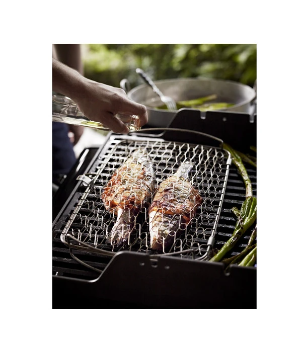 Jeder, der schon einmal zarte Fischfilets grillen wollte, kennt das Ärgernis, wenn sie beim Wenden oder Herunternehmen zerbrechen. Mit dem Weber Fisch- und Gemüsehalter wird Ihnen das nie wieder passieren, denn er ist speziell für besonders empfindliches Grillgut konzipiert. Der Weber Fisch- und Gemüsehalter besteht aus einem doppelten feinen Gitternetz, das empfindliches Grillgut sicher hält, ohne es zu zerdrücken. Sehr praktisch sind auch die beiden großen seitlichen Bügelgriffe, mit denen der Weber Fisch- und Gemüsehalter bequem auf den Grill gelegt, gewendet und herunter genommen werden kann. Der Weber Fisch- und Gemüsehalter besteht aus hochwertigem Edelstahl, der selbstverständlich nicht rostet und sich wunderbar leicht reinigen lässt.